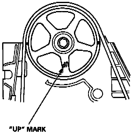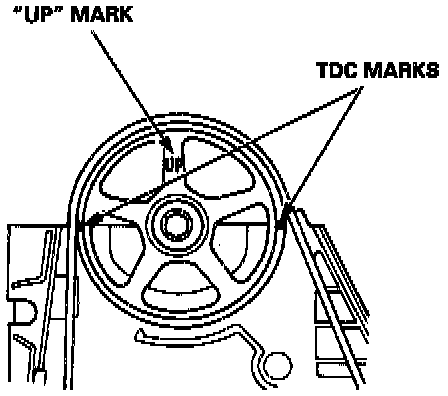 3. Set the No. 1 piston at TDC. The "UP" mark on the cam-shaft pulley should be at top, and the TDC marks should align with the cylinder head surface.