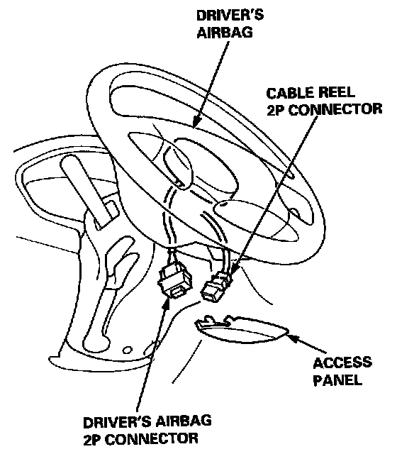 Remove the access panel from the steering wheel, then disconnect the 2P connector between the driver's airbag and cable reel.