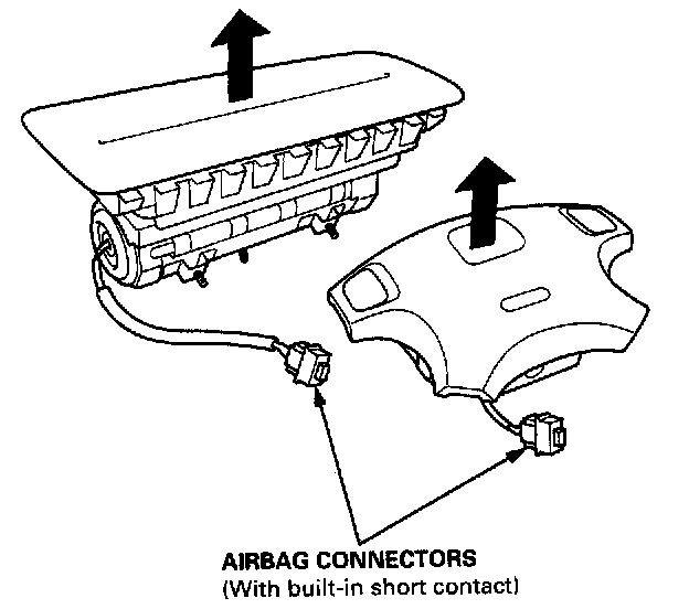 Store the removed airbag assembly with the pad surface up. The driver's (and front passenger's) airbag connector(s) has (have) a built-in short contact.
