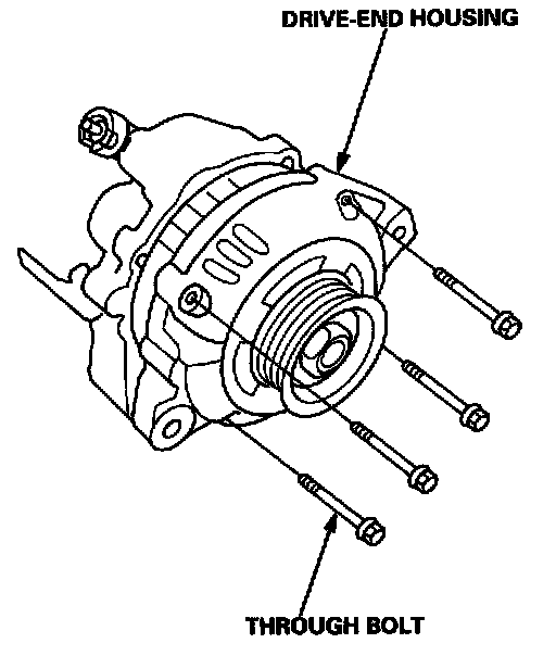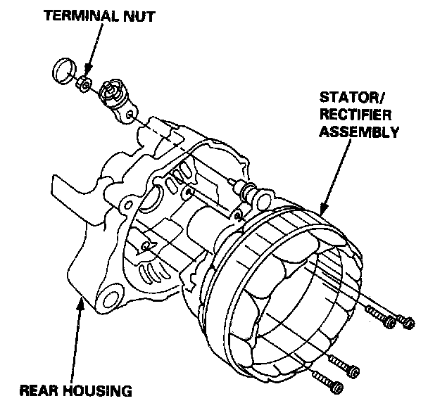 5. Separate the rear housing from the stator/rectifier assembly by removing the four screws and the terminal nut.