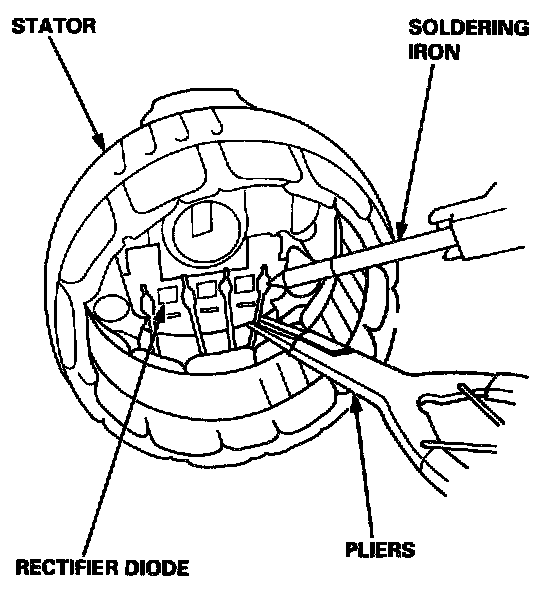 - To avoid damaging the diodes with heat, pinch the stator leads between pliers to carry heat off, and apply the soldering iron only long enough to separate the leads from the rectifier.