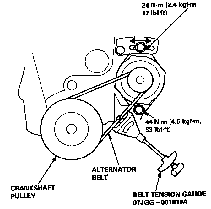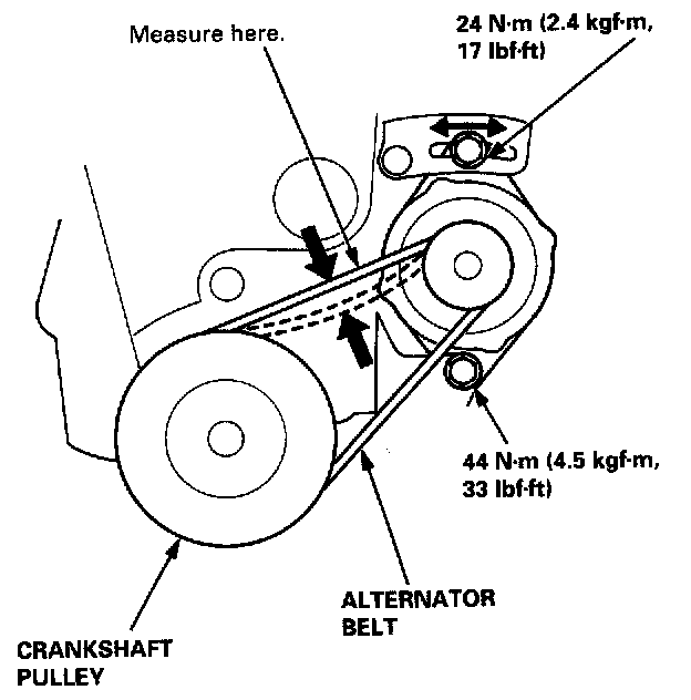 Apply a force of 98 N (10 kg, 22 lb), and measure the deflection between the alternator and the crankshaft pulley.