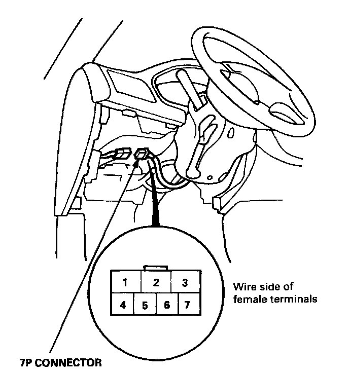 1. Remove the driver's dashboard lower cover and knee bolster.2. Disconnect the 7P connector from the main wire harness.