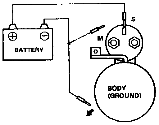 NOTE: Before starting the following checks, disconnect the wire from terminal M, and make a connection as described below using as heavy a wire as possible (preferably equivalent to the wire used for the car).Pull-In Coil Test:
