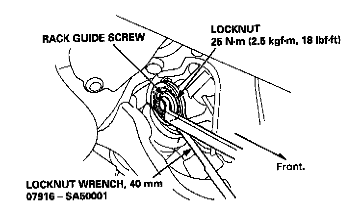 2. Tighten the rack guide screw to 25 Nm (2.5 kgf-m, 18 ft. lbs.), then loosen it.