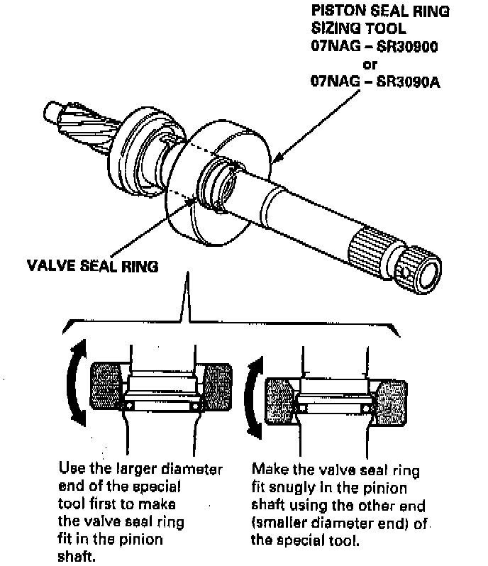 12. Turn the special tool over, and set the smaller diameter end of the special tool over the valve seal ring. Move the special tool up and down several times to make the valve seal ring fit snugly in the pinion shaft.