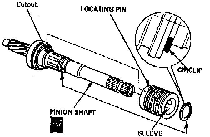 18. Apply power steering fluid to the surface of the pinion shaft. Assemble the sleeve over the pinion shaft by aligning the locating pin on the inside of the sleeve with the cutout in the shaft. Then install the new circlip securely in the pinion shaft groove.