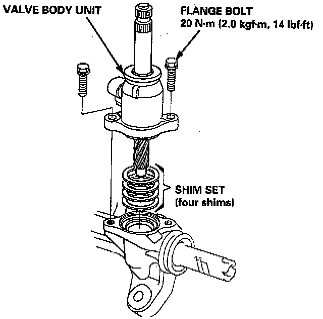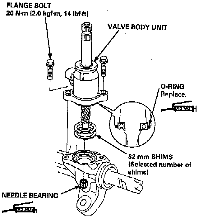 NOTE: Only reinstall the original 32 mm shim(s) when the steering gearbox is reassembled without replacing the pinion shaft, valve housing, and gearbox housing with new ones. If the pinion shaft, valve housing, and gearbox housing are replaced, select the new shim(s) as follows.