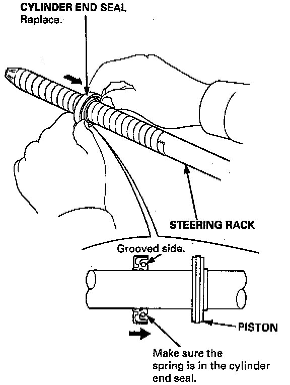 42. Install the cylinder end seal onto the steering rack with its grooved side toward the piston.
