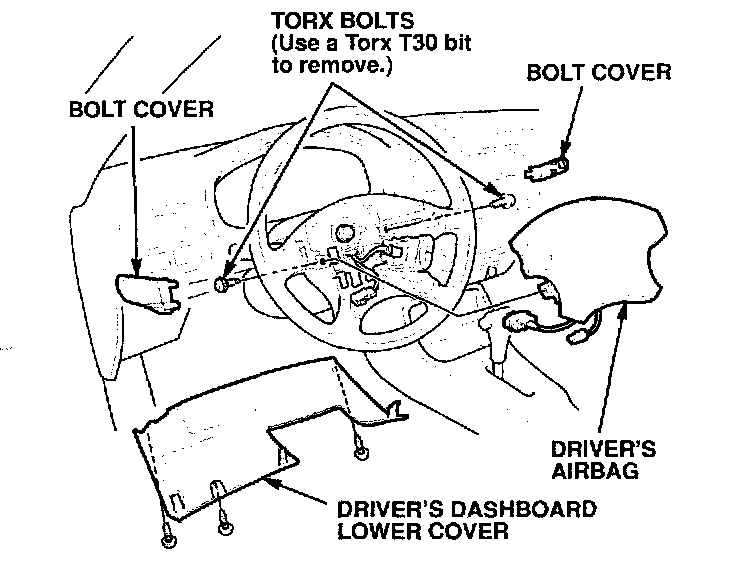 5. Remove the two bolt covers from the back of the steering wheel. Then remove and discard the two Torx bolts, disconnect the horn connector, and remove the driver's airbag.