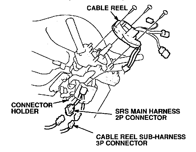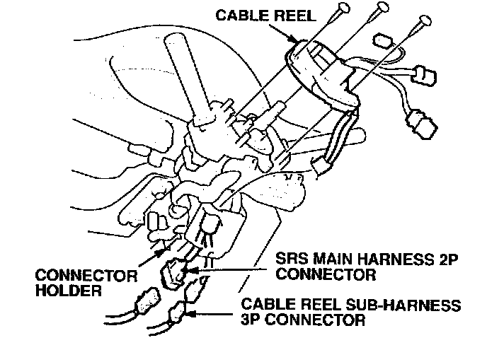 15. Carefully reinstall the cable reel on the steering column with the original screws. Then reconnect the 3P connector to the cable reel sub-harness and the 2P connector to the SRS main harness, and reinstall the connectors in their holders.