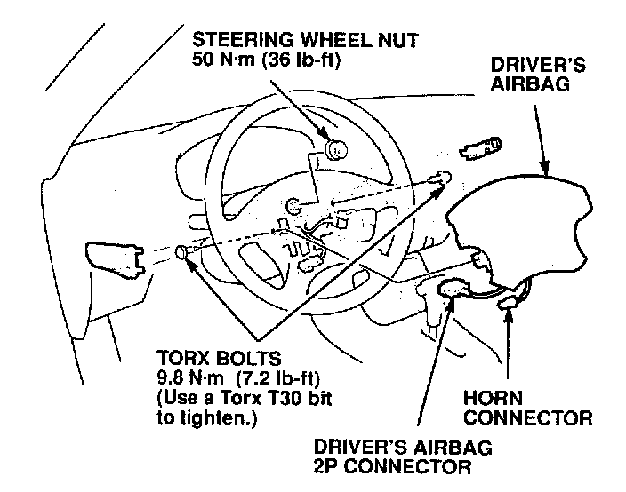 20. Reconnect the airbag horn connector to the steering wheel, and reinstall the airbag with two new Torx bolts (see PARTS INFORMATION). Tighten the bolts to 10 N.m (7 lb-ft), then reinstall the bolt covers.