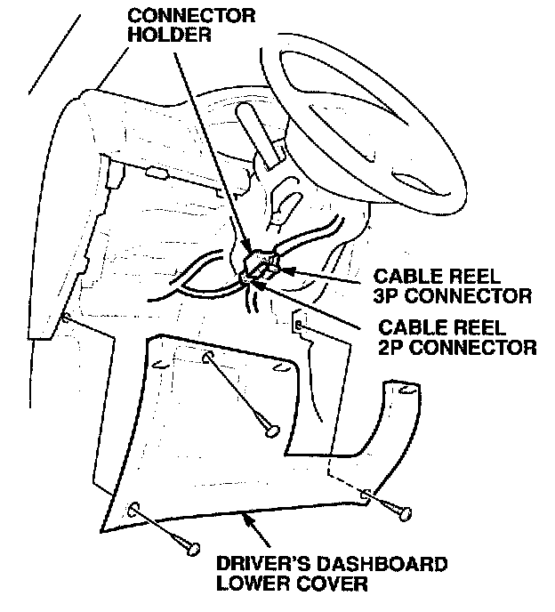 21. Attach the cable reel 2P and 3P connectors to the connector holder. Then reinstall the driver's dashboard lower cover.