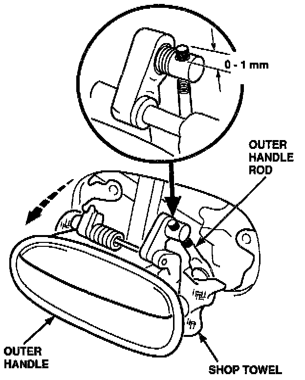 4. Pull the outer handle away from the door. Do not disconnect the outer handle rod. Place a shop towel in the door handle opening to protect the door from getting scratched.