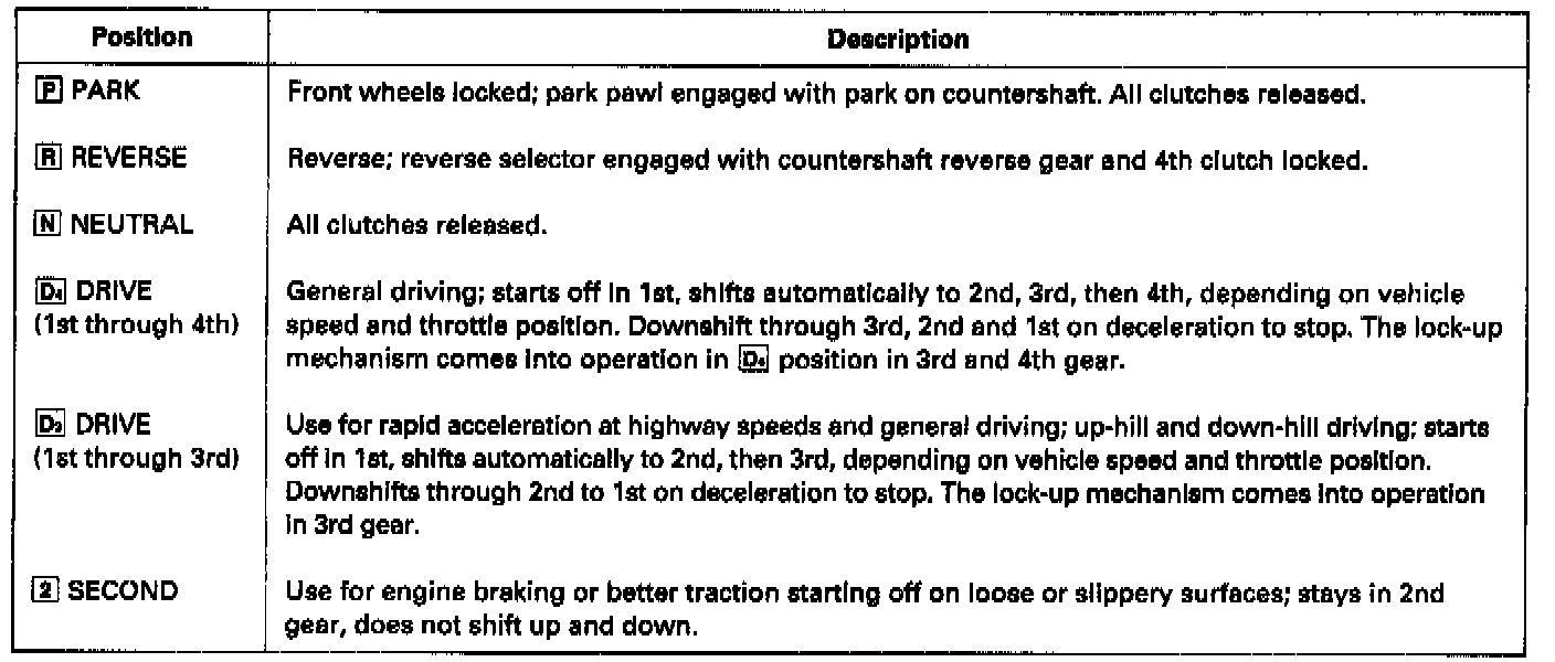 The shift lever has six positions: [P] PARK, [R] REVERSE, [N] NEUTRAL, [D4] 1st through 4th gear ranges, [D3] 1st through 3rd gear ranges, [2] 2nd gear.