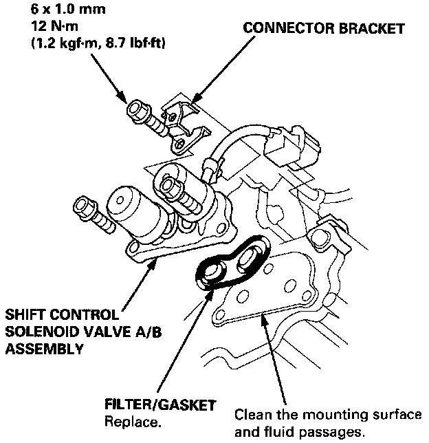 2. Clean the mounting surface and fluid passages of the shift control solenoid valve assembly, and install a new shift control solenoid valve A/B with a new filter/gasket and the clamp bracket.