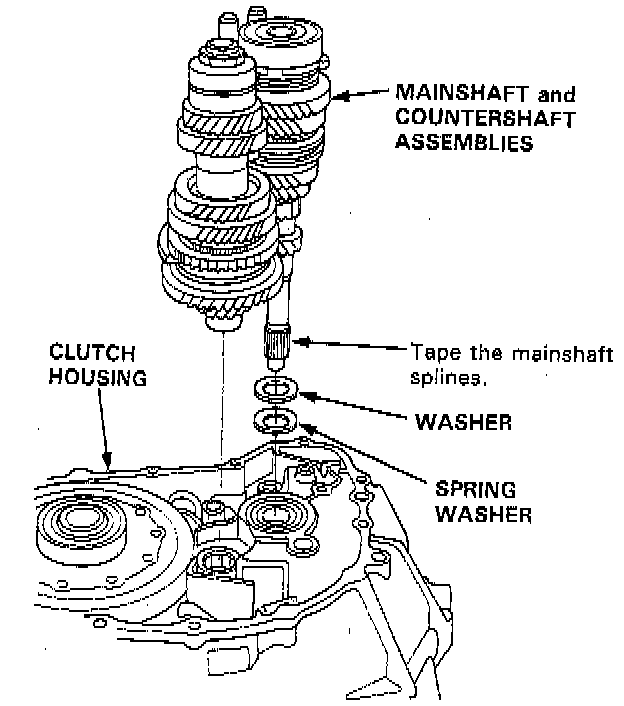 NOTE: Before removing the mainshaft and countershaft assemblies, tape the mainshaft splines to protect the seal.
