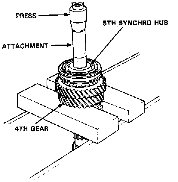 6. Support 4th gear on steel blocks, and press the main shaft out of the 5th synchro hub as shown.