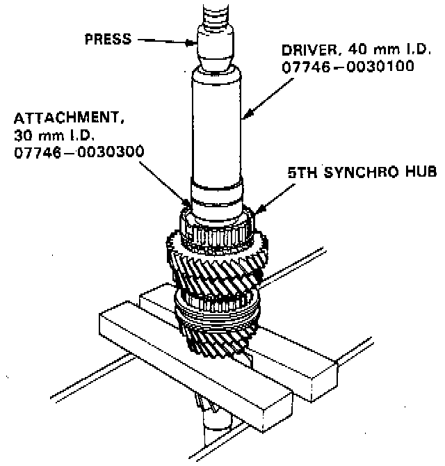 CAUTION: Remove the synchro hubs using a press and steel blocks as shown. Use of a jaw-type puller can cause damage to the gear teeth.
