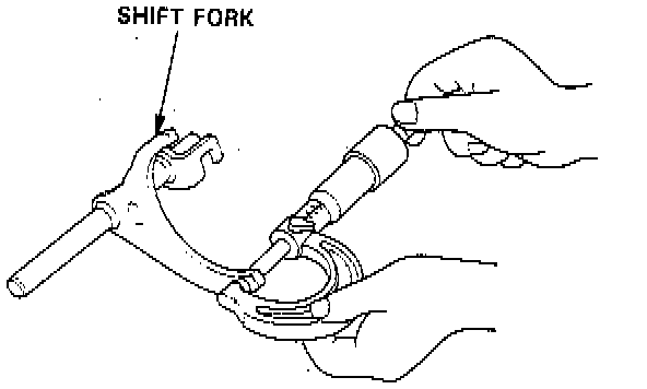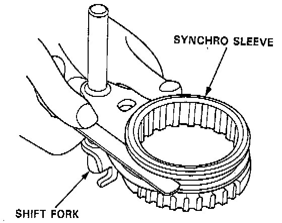 NOTE: The synchro sleeve and the synchro hub should be replaced as a set.1. Measure the clearance between each shift fork and its matching synchro sleeve.