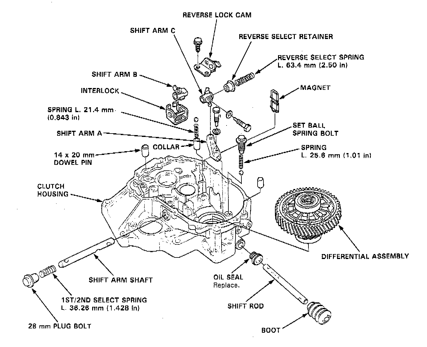 6. Remove shift arms C and B. and the interlock, then remove the reverse select spring and retainer.