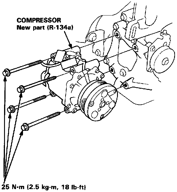 ^ If you're installing a new compressor, drain all the refrigerant oil from the removed compressor, and measure its volume. Subtract the volume of drained oil from Sanden: 130 ml (4 1/3 fl.oz, 4.6 Imp.oz) or Nippondenso: 120 ml (4 fl.oz, 4.2 Imp.oz); the result is the amount of oil you should drain from the new compressor (through the suction fitting).