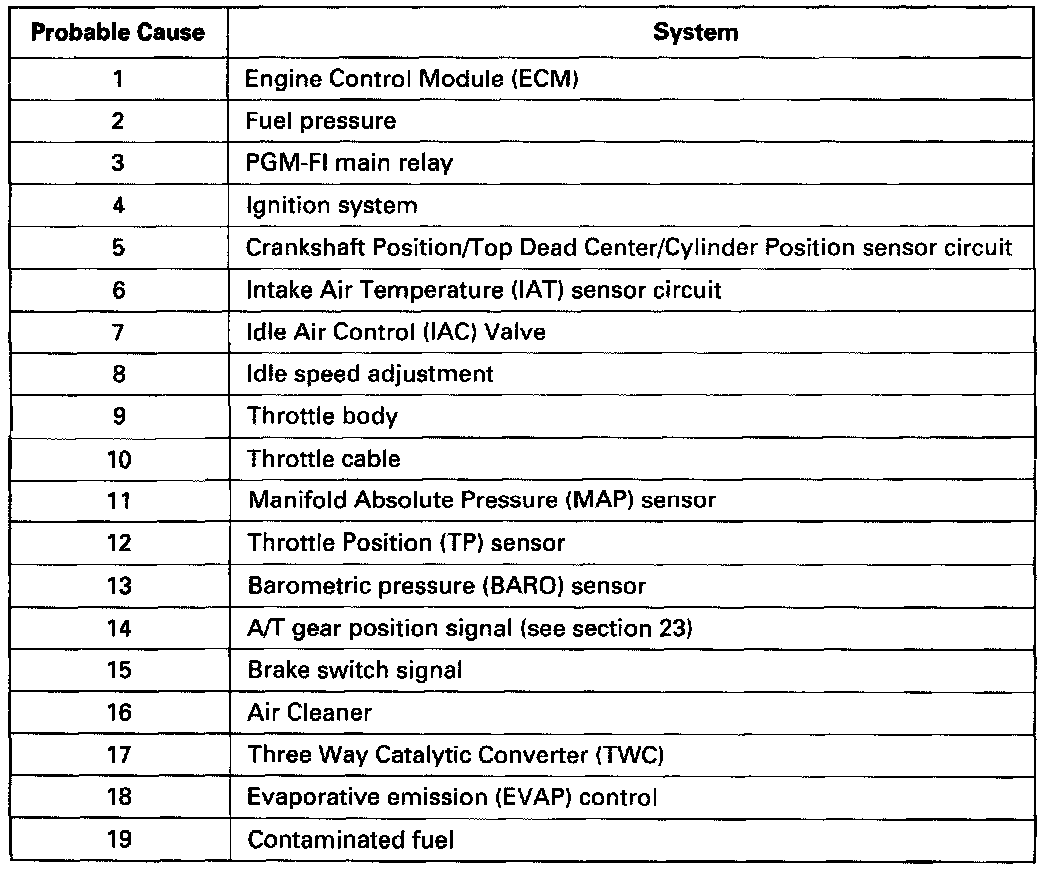 Symptom ChartListed below are symptoms and probable causes for problems that DO NOT cause the malfunction Indicator Lamp (MIL) to come on. Troubleshooting each probable cause in the order listed (from left to right) until the Symptom is eliminated. The probable cause and troubleshooting page reference can be found below.