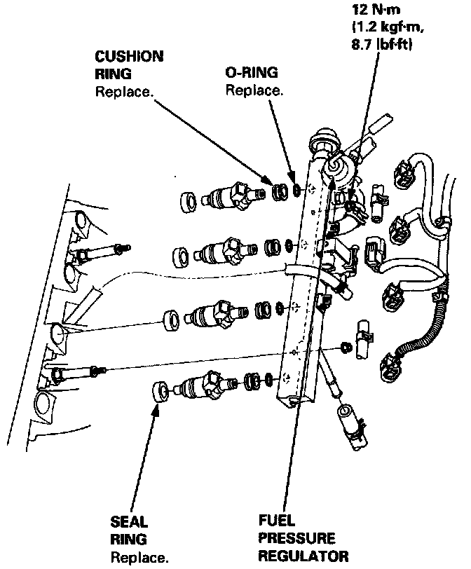 5. Loosen the retainer nuts on the fuel rail and harness holder (D16Y8, B16A2 engine). Remove the harness from the fuel rail (D16Y7 engine).