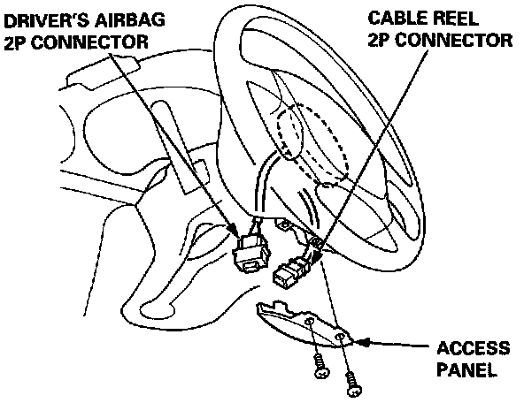 Remove the access panel from the steering wheel, then disconnect the 2P connector between the driver's airbag and cable reel.