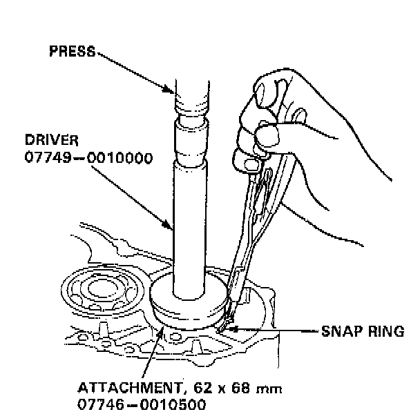 1. To remove the sub-shaft ball bearing from the transmission housing, expand the snap ring with snap ring pliers, then push the bearing out using the special tools and a press as shown.
