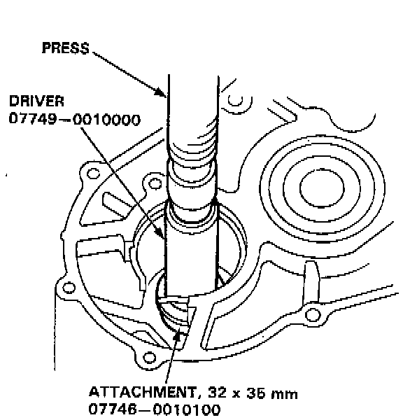 5. Expand the snap ring with snap ring pliers, then insert the ball bearing part-way into the housing using the special tools and a press as described in step 1. Install the bearing with the groove facing outside the housing.