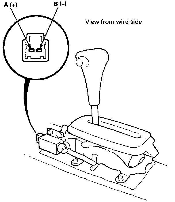1. Remove the console, then disconnect the 2P connector of the shift lock solenoid from the main wire harness.NOTE: Do not connect power to the B (-) terminal (reverse polarity) or you will damage the diode inside the solenoid.