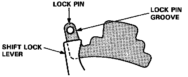 - When the shift lock solenoid is ON, check that there is a clearance of 2.5 ± 0.5 mm (0.098 ± 0.020 in) between the top rear corner of the shift lock lever and the lock pin groove, then tighten the self-locking nuts.