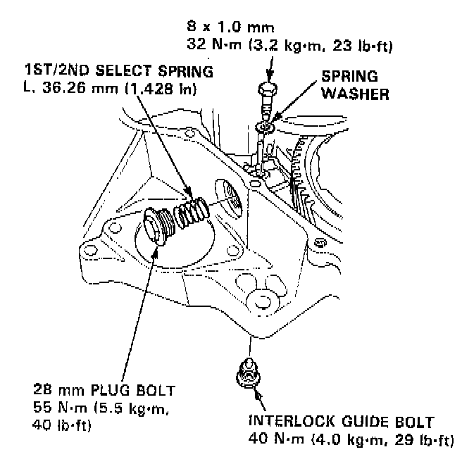 14. Install the 1st/2nd select spring, 28 mm plug bolt, and interlock guide bolt.