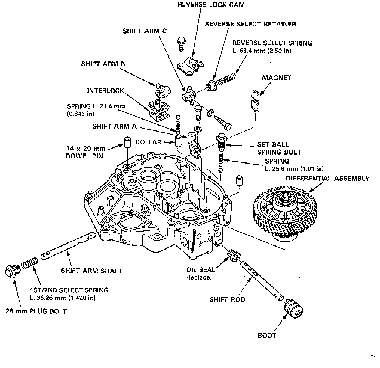 6. Remove shift arms C and B. and the interlock, then remove the reverse select spring and retainer.
