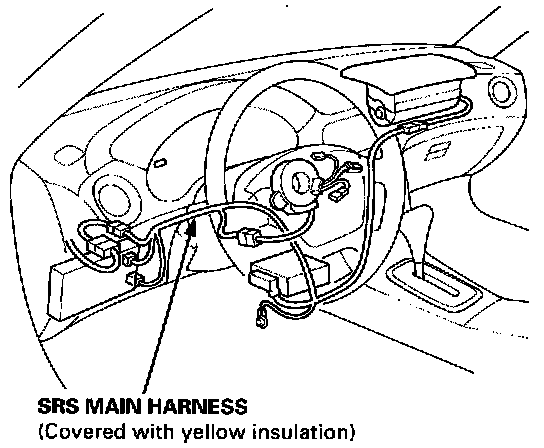 ^ All SRS wire harnesses are covered with yellow insulation. Before you disconnect any part of an SRS wire harness, disconnect the airbag connectors.