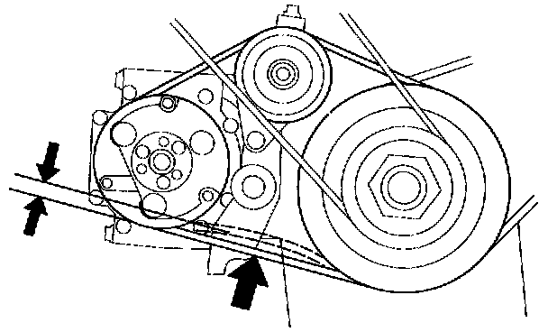 1. Apply a force of 98 N (10 kg, 22 lb), and measure the deflection between the A/C compressor and the crankshaft pulley.