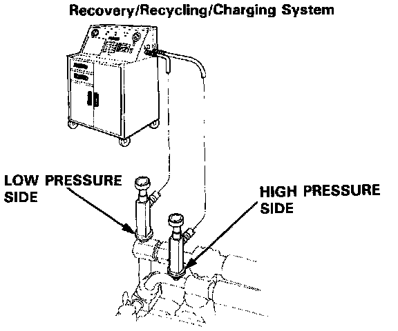 2. Connect a R-134a refrigerant Recovery/Recycling/Charging System to the car, as shown, following the equipment manufacturer's instructions.