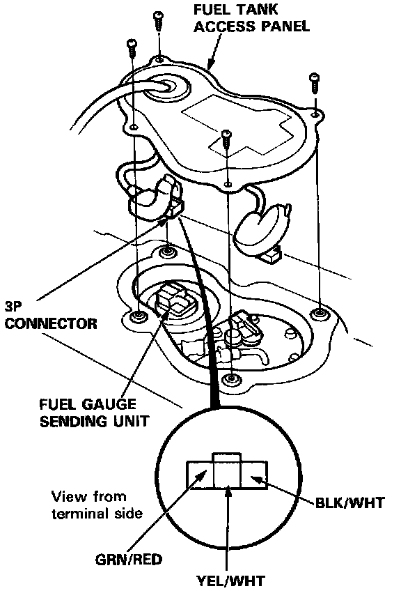 ^ If the light does not come on, remove the access panel, and disconnect the 3P connector from the fuel gauge sending unit. Connect the GRN/RED terminal to the BLK/WHT terminal with a jumper wire.