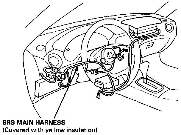 ^ All SRS wire harnesses are covered with yellow insulation. Before you disconnect any part of an SRS wire harness, disconnect the airbag connectors.
