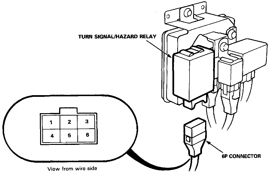 1. Remove the driver's side kick panel, then disconnect the 6P connector from the turn signal/hazard relay.