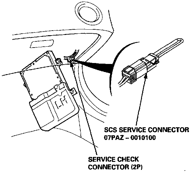 Connect the SCS service connector to Service Check Connector as shown. (The 2P Service Check Connector is located under the dash on the passenger's side of the car.) Turn the ignition switch ON.