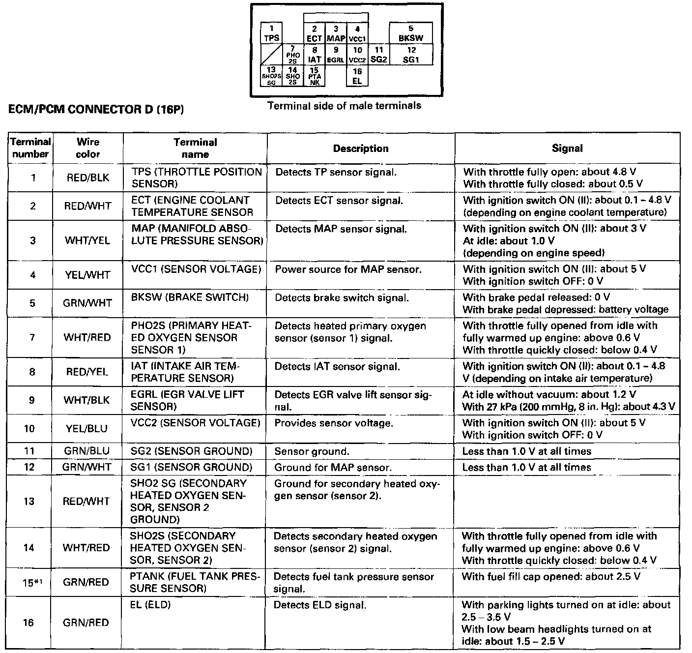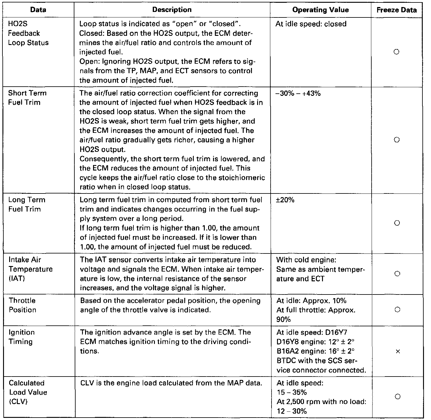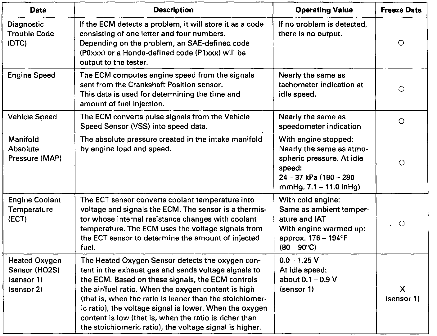 By connecting the OBD-II scan tool or the Honda PGM Tester to the 16P data link connector (DLC), various data can be retrieved from the ECM. The items listed in the table below conform to the SAE recommended practice. The Honda PGM Tester also reads data beyond that recommended by SAE. Understanding this data will help to find the causes of intermittent failures or engine problems.