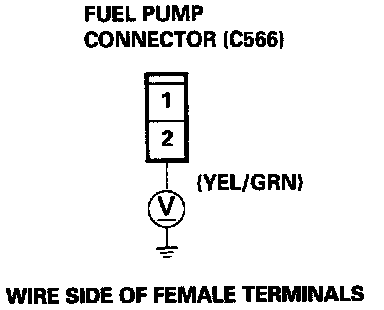 WARNING: Do not smoke during the test. Keep open flame away from your work area.If you suspect a problem with the fuel pump, check that the fuel pump actually runs; when it is ON, you will hear some noise if you hold your ear to the fuel fill port with the fuel fill cap removed. The fuel pump should run for two seconds, when ignition switch is first turned on. If the fuel pump does not make noise, check as follows: