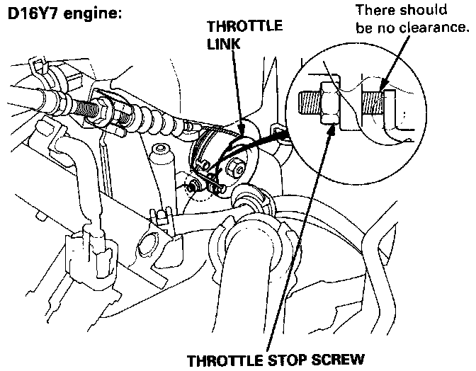 CAUTION: Do not adjust the throttle stop screw. It is preset at the factory.1. Start the engine. Hold the engine at 3,000 rpm with no load (A/T in "N" or "P" position, M/T in neutral) until the radiator fan comes on, then let it idle.
