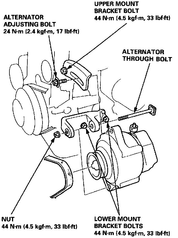 2. Move the alternator to obtain the proper belt tension, then retighten the adjusting bolt and the through bolt nut to the specified torques.