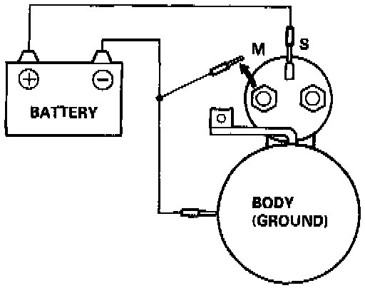 NOTE: Before starting the following checks, disconnect the wire from terminal M,and make a connection as described below using as heavy a wire as possible (preferably equivalent to the wire used for the car).Pull-In Coil Test: