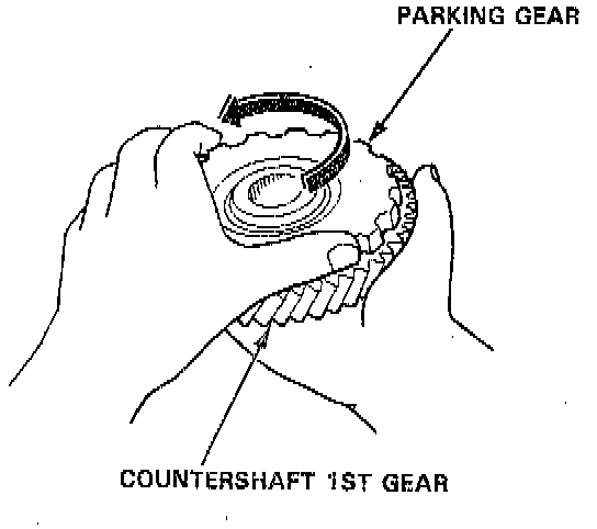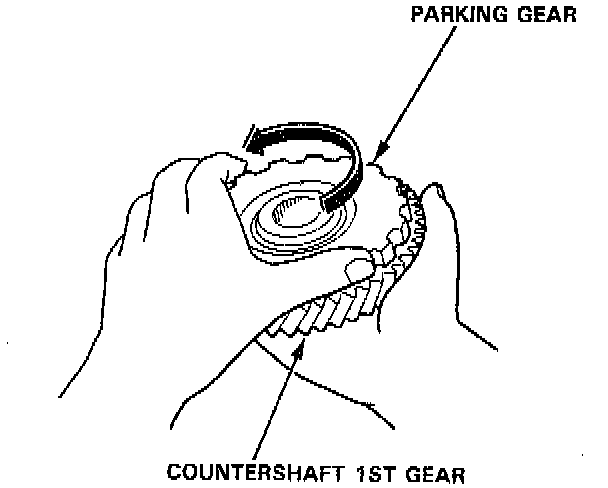 3. After the parts are assembled, hold countershaft 1st gear and turn the parking gear in the direction shown to be sure it turns freely. Also make sure the parking gear dose not turn in the opposite direction.