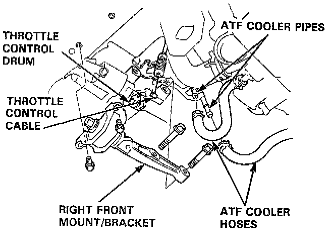 18. Remove the right front mount/bracket, then remove the end of the throttle control cable from the throttle control drum.