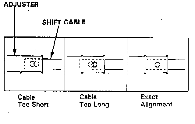 3. Check that the hole in the adjuster is perfectly aligned with the hole in the shift cable. There are two holes in the adjuster. They are positioned 908 apart to allow cable adjustment in 1/4 turn increments.